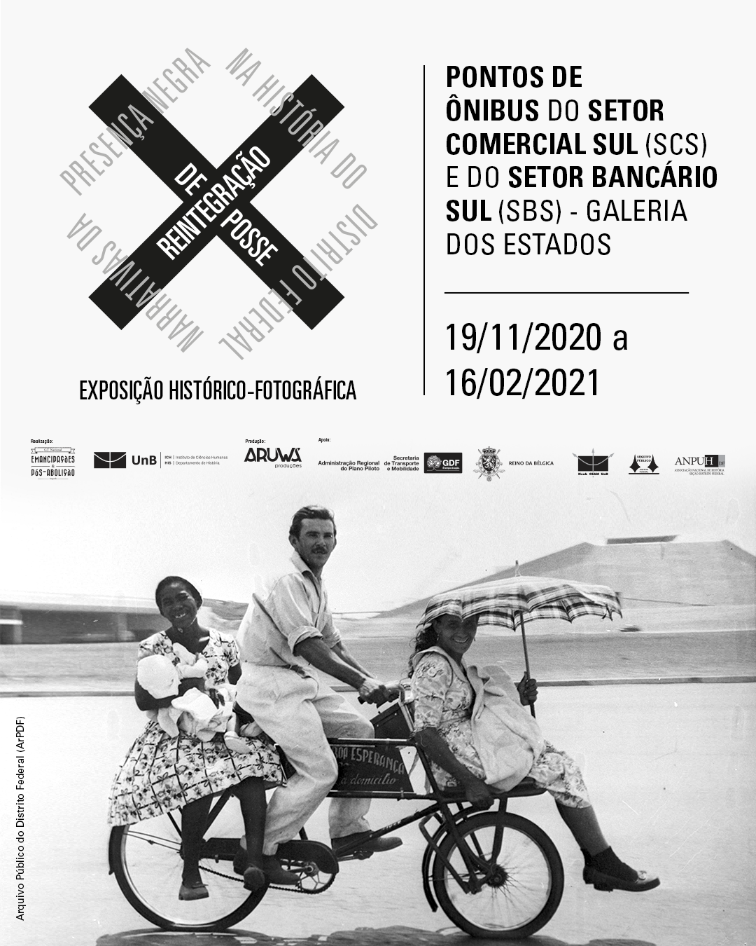 A mostra foi idealizada a partir de registros fotográficos pesquisados no Arquivo Público do DF, que datam de 1956 a 1998, por pesquisadores da Universidade de Brasília (UnB). O projeto busca acabar com narrativas racistas que são construídas acerca do espaço do negro e enaltecer a importância dessas pessoas, que, segundo dados do Instituto Brasileiro de Geografia e Estatística (IBGE), compõem 57% da população do Distrito Federal. Saiba mais em https://www.instagram.com/historianegradf/?hl=en